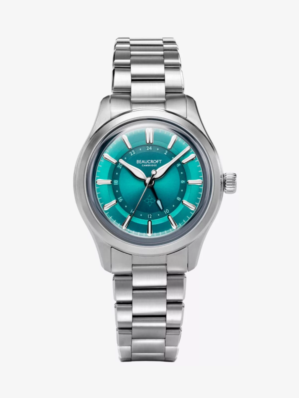 The most distinctive part of the watch is not just the movement but the way Beaucroft has approached the dial. The Tropical Teal edition uses a layered display with a raised chapter ring, boxed sapphire crystal, and darker outer section to create a sense of depth. That gives it a more considered visual character than many GMTs in this price range.