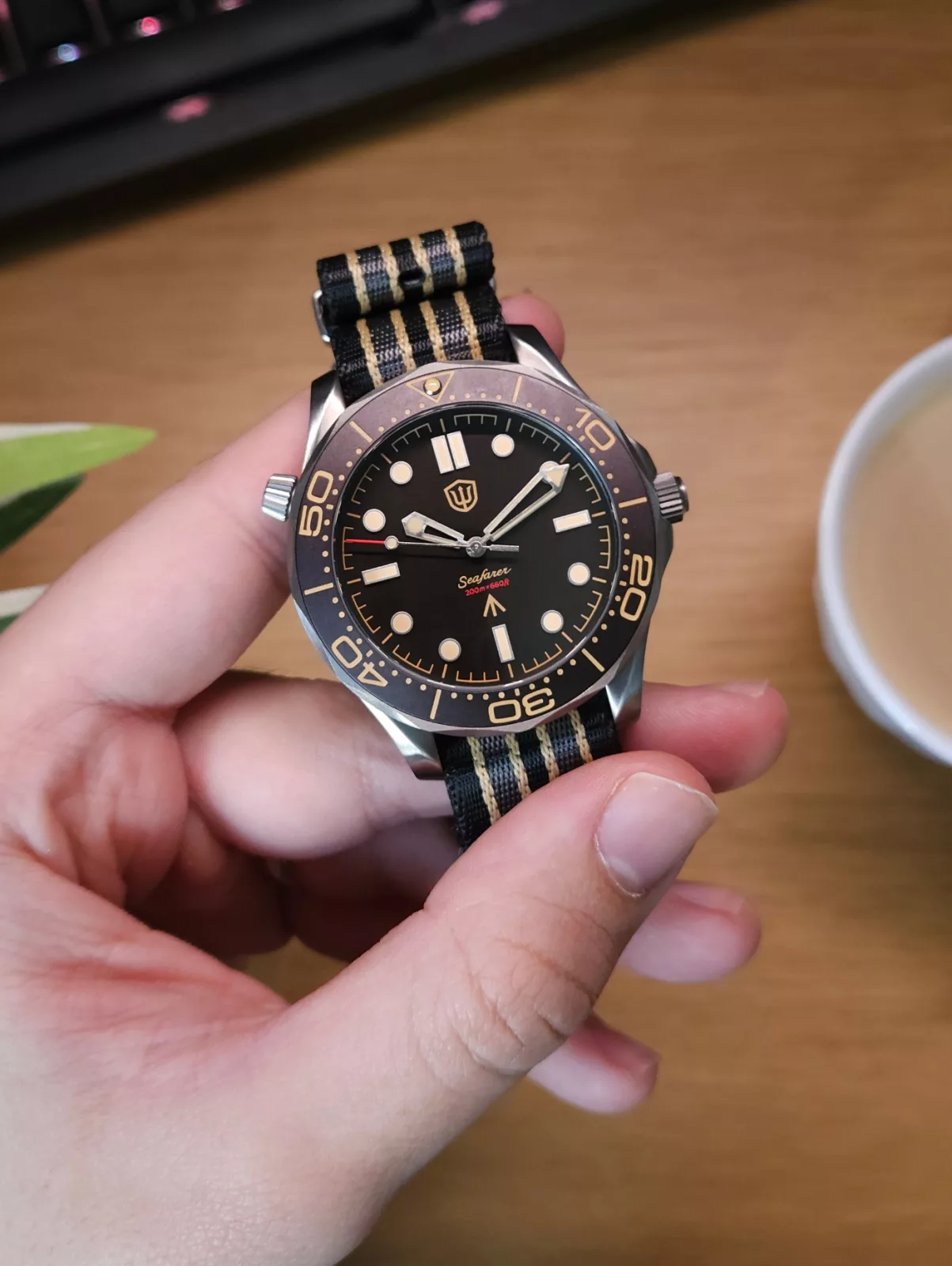 Visually, it is clearly inspired by the Omega Seamaster Diver 300M 007 Edition. The absence of the domed sapphire crystal is the most obvious distinction, along with (obviously) Watchdives’ own branding and “Seafarer” model designation. There is no attempt at counterfeiting, it just tries to be a transparent homage. It offers design accessibility, not brand replication.